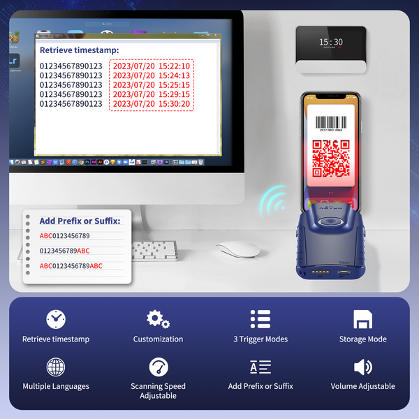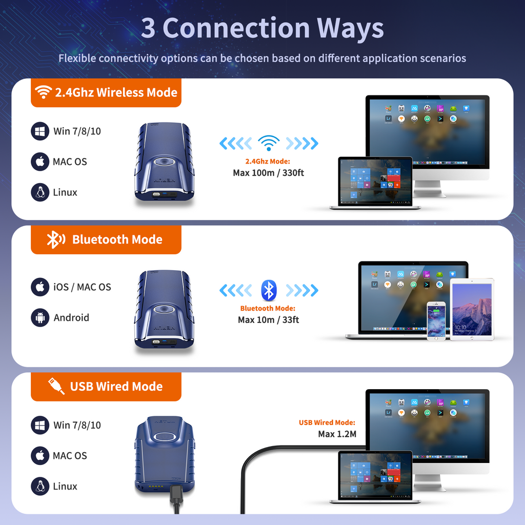 Drahtlose Bluetooth-Technologie – NETUM-Barcode-Scanner mit hinterem Clip. Lässt sich problemlos mit einer Vielzahl von Bluetooth-fähigen Smartphones, Tablets, Notebooks und Desktop-Computern verbinden. Sie können den Barcode einfach scannen und gleichzeitig die Daten auf Ihrem Telefon überprüfen. Bluetooth HID, SPP, und BLE-Modus sind alle verfügbar. Arbeiten Sie mit Windows, Mac OS, Android, iOS.