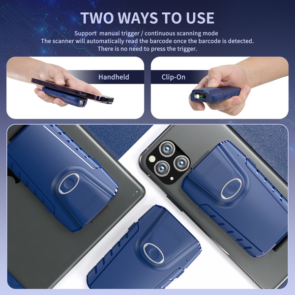 Zwei Verwendungsmöglichkeiten – Der NETUM E950 ist kompakt, effizient und kostengünstig. Sie können ihn als rückseitigen Clip-Barcodescanner zur Befestigung am Mobiltelefon verwenden oder ihn allein als normalen Bluetooth-Barcodescanner verwenden. Manueller Auslösemodus + Kontinuierlicher Scanmodus. Der Scanner liest den Barcode automatisch, sobald er erkannt wird. Es ist nicht erforderlich, den Auslöser zu drücken.