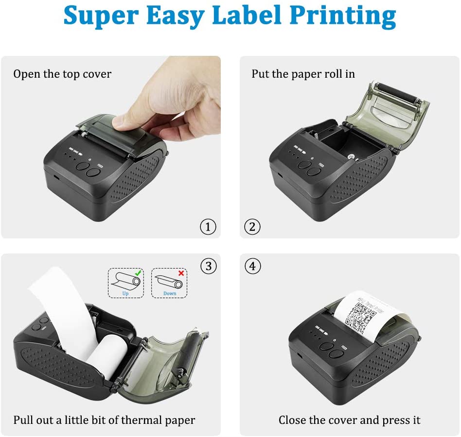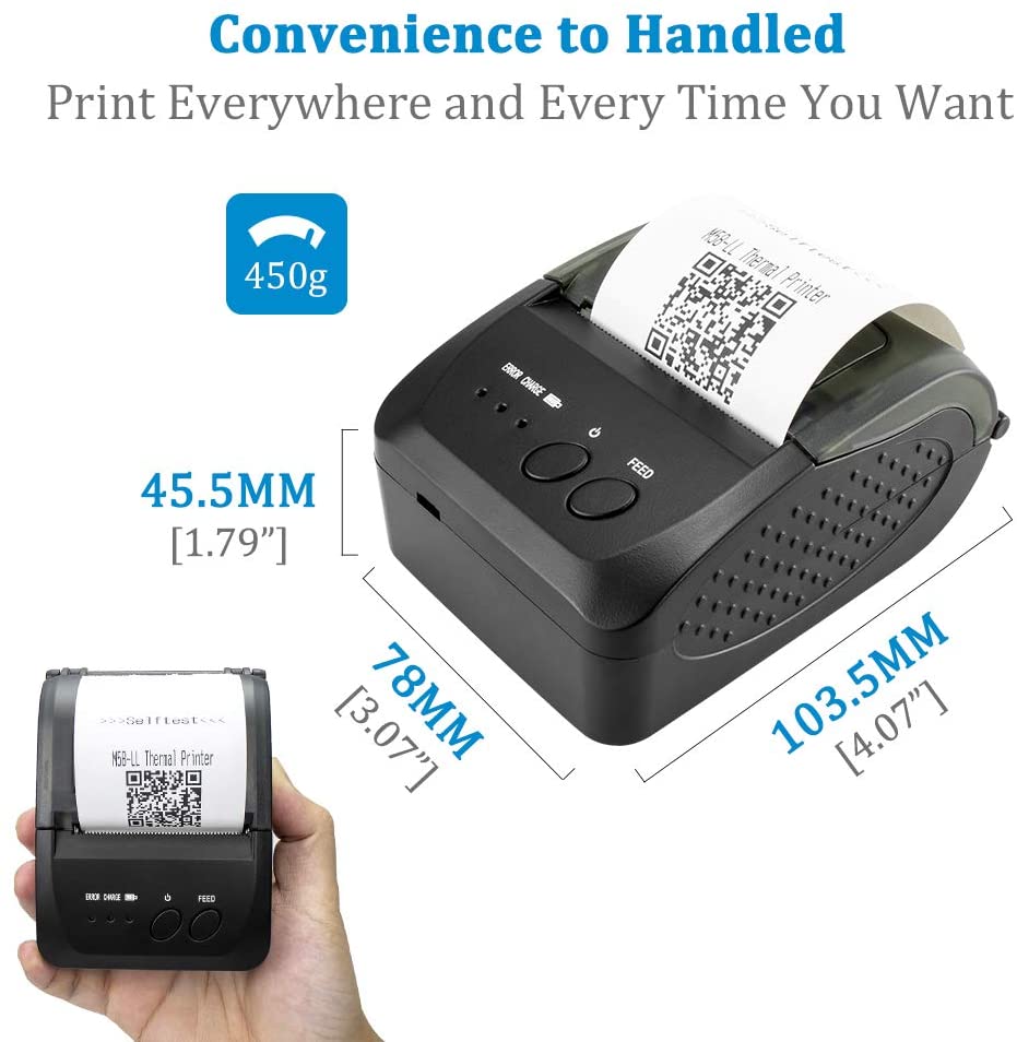 Built-in rechargeable 1500mAh lithium-ion battery, standby time can reach 5 - 6 days. Bluetooth 4.0, auto sleep, auto awake, save electricity. Mobile printers for android commands: ESC / POS / STAR compatible command set, Resolution: 8 dots / mm ( 203DPI ).Paper dimensions: 58.0 + / - 0.1mm x diameter 40.0mm.